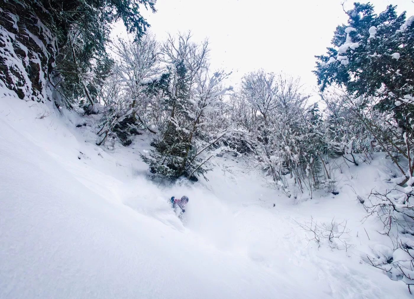 After sharing excitement for the day ahead, we skinned in a short way through powder-filled trees until reaching the top of the bowl. The bowl-like terrain was lined with cliffs at the top, some ranging 5 to 20 feet. At the bottom, it shortened in width and funneled into a gully that was choked up with debris and vegetation. Although the runs would be small in size, the snow would be phenomenally deep, enough to drop some of the larger cliffs.