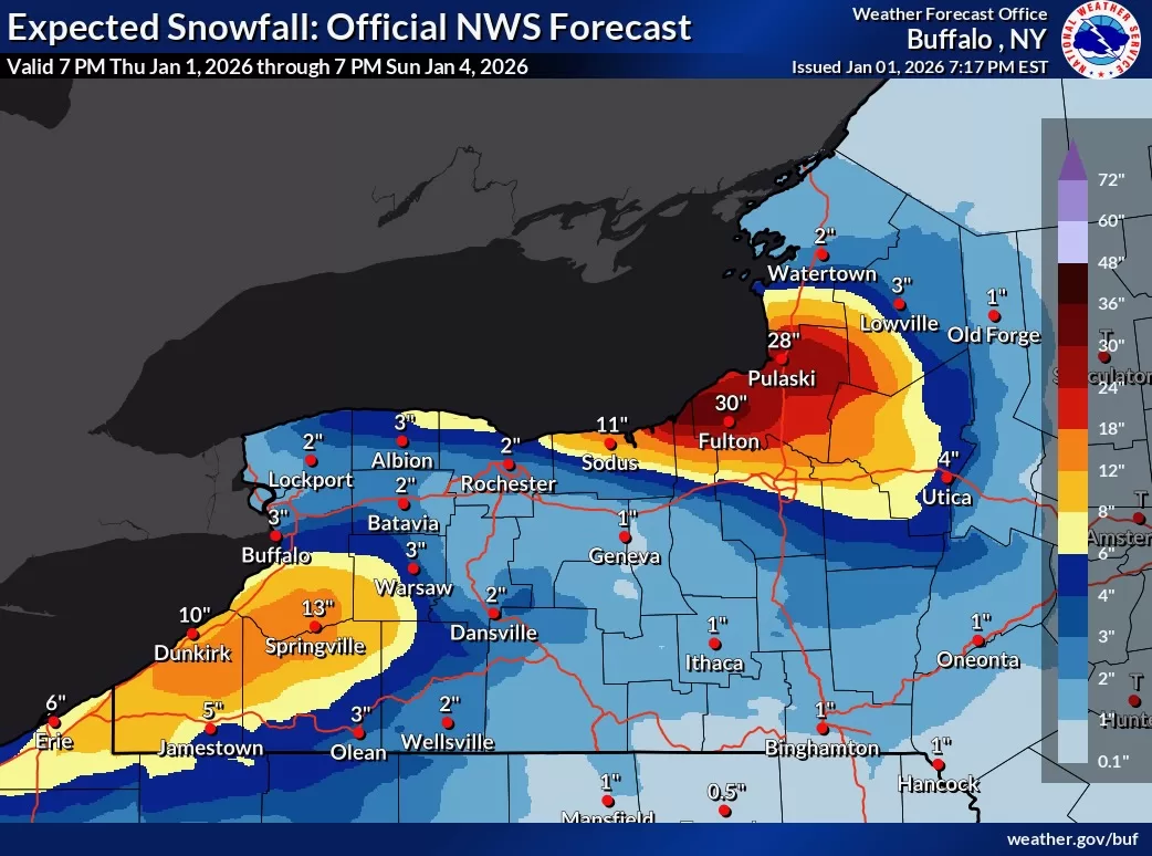 This storm system was split into two parts. The first part was forecast to hit CNY on December 29th through New Year’s Eve, while the second part was supposed to hit the southern Tug Hill region — zones in Oswego County — from late New Year’s Day to January 4th.