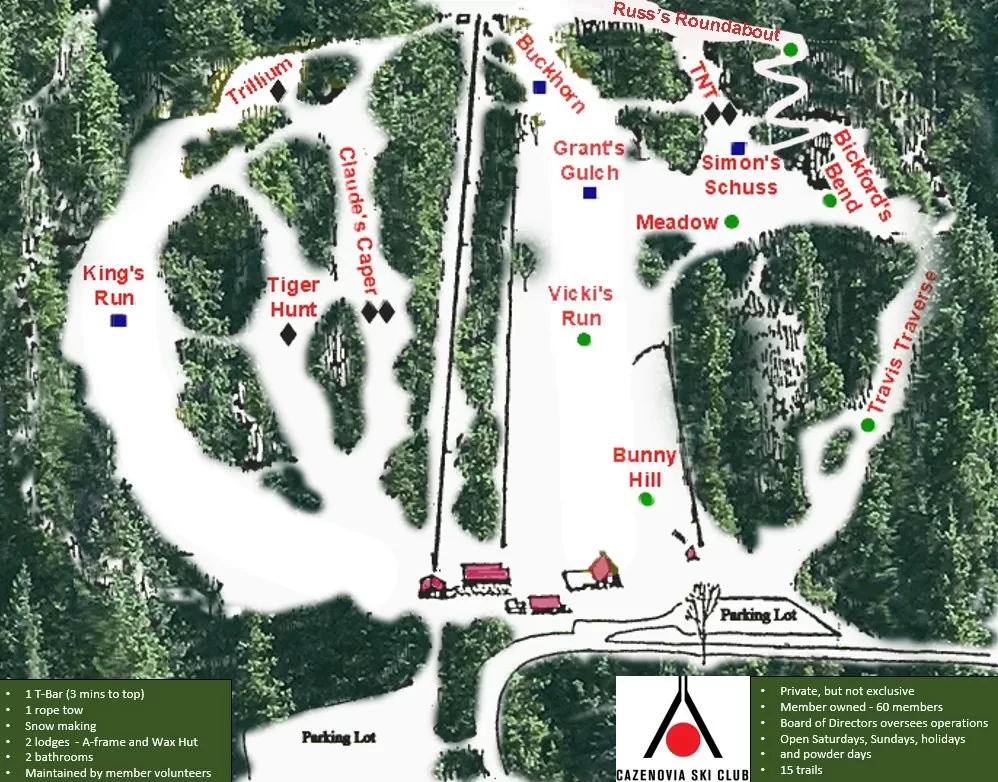 Cazenovia Ski Club is private club on a small hill on Rathbun Road in Cazenovia NY. With 500 feet of vertical drop and 100 inches of actual NWS measured snowfall, the 25 acres of skiable terrain are a lot of fun. The hill is known for its steepness, and the Hall T-bar is known for its speed. Powder days at Caz are the stuff of dreams. The lodge is a model of beautiful simplicity.
