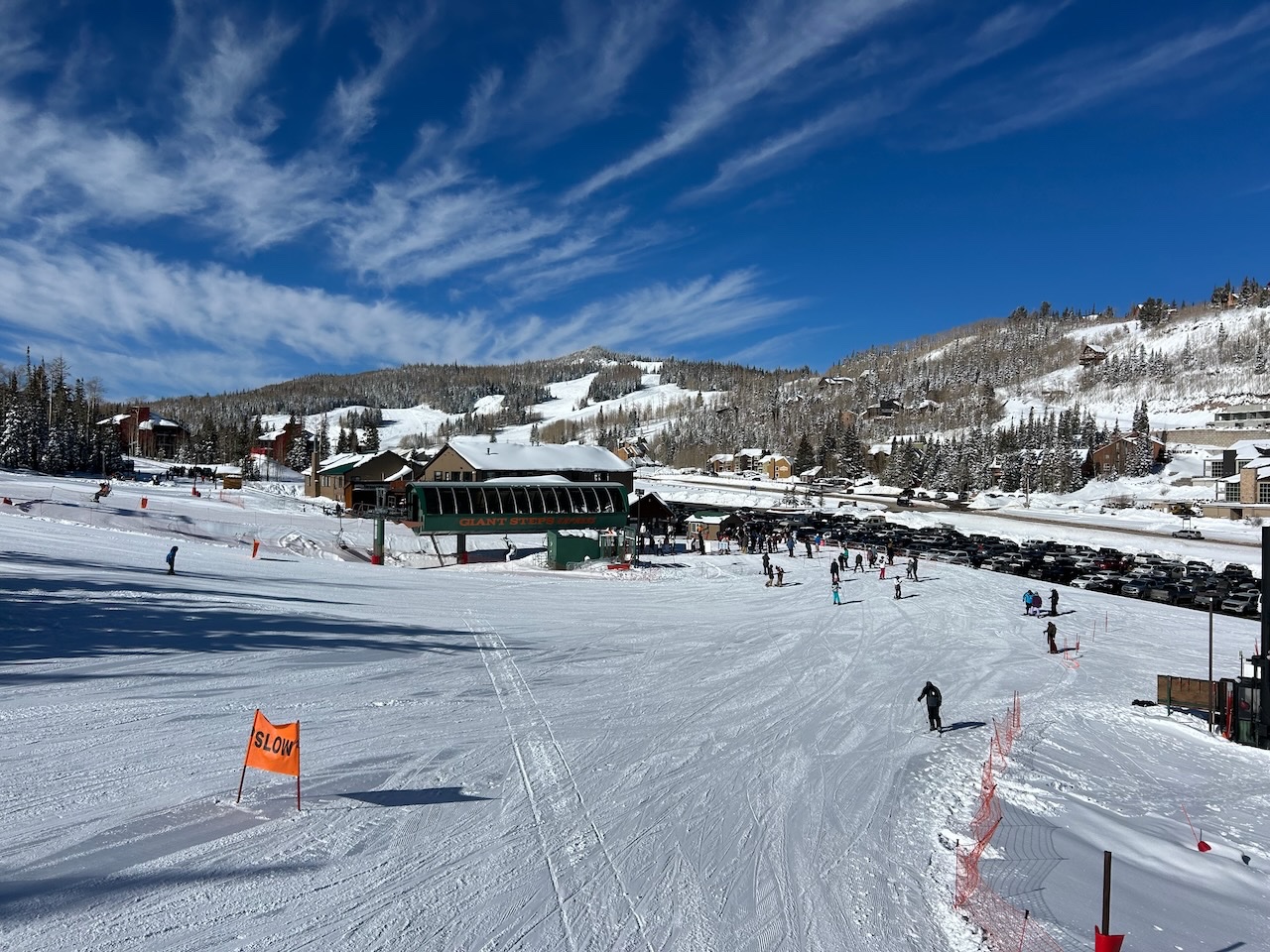 We hadn't bothered to check when lifts opened and ended up arriving in time for great parking at the Giant Steps lodge. Lifts open at 9:30 on weekends and 10:00 weekdays. We pulled in about 9:00 after an easy 45 minute drive from Beaver with the last 14 miles on mountain road going up from I-15. More people stay in Cedar City to the south, which is 5-10 minutes closer. Cedar City population is about 40,000, which is ten times more than Beaver.