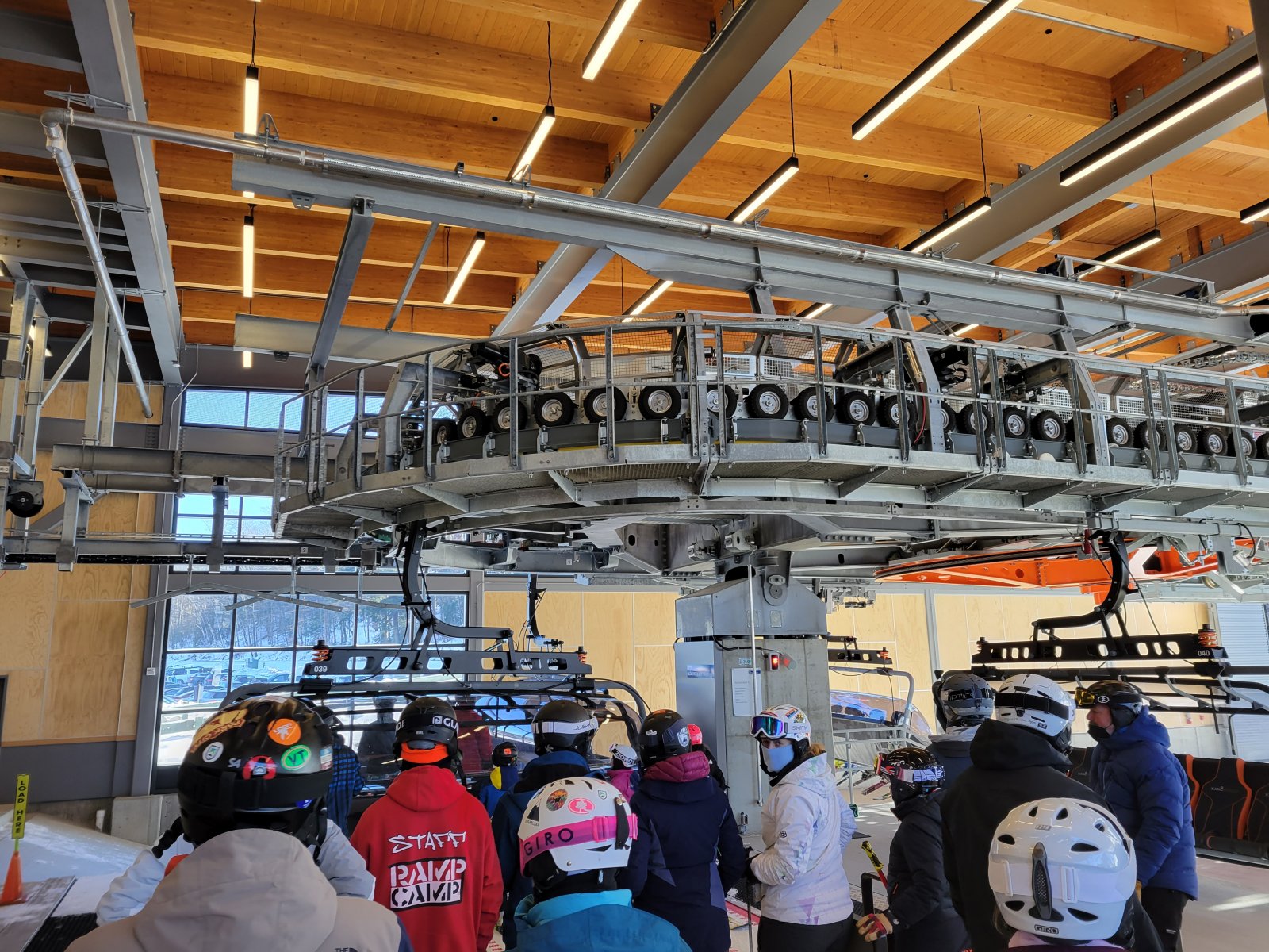 The bottom terminal is inside a large building. This building also houses the chairs, which are parked inside every night. This lift is bottom drive, but you'd hardly notice. It has a Doppelmayr Direct Drive (DDD). The motor is attached directly to the bullwheel and there is no gearbox. Not only is this more efficient and more reliable, but it is also extremely quiet. There are return terminals that are louder than this drive terminal. There are loading gates and a conveyor. This is important because it helps to line up all 8 people so they all sit down at the same time.