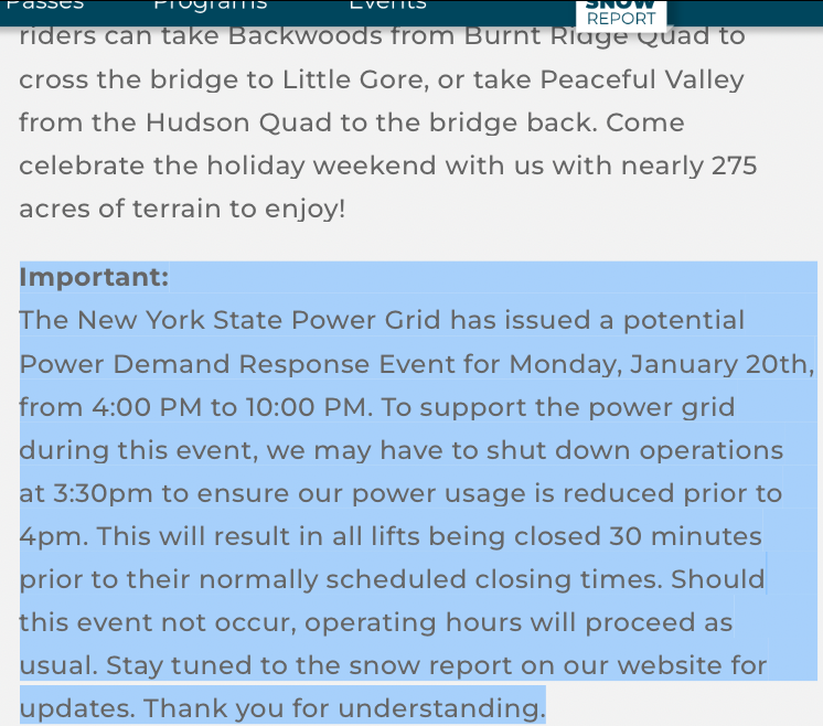 "Whiteface Operational Update for Monday, 1/20/2025:The New York State ISO Power Grid has issued a Power Demand Response Event for Monday, January 20th, from 4:00 PM to 10:00 PM. As a result, the following lifts will have their last chair at 3:45 PM (instead of the usual 4:00 PM): Falcon Flyer, Warhorse, The Notch, Cub Carpet, and Coyote Carpet. Upper lifts, including Little Whiteface, Summit Quad, and Lookout Mountain, will close at the regular time of 3:30 PM. The Scenic Cloudsplitter Gondola ride will load its last cabin at 2:45 PM. In accordance with this curtailment, the snowmaking system will be temporarily shut down in the afternoon and will resume after 10:00 PM, subject to conditions”.