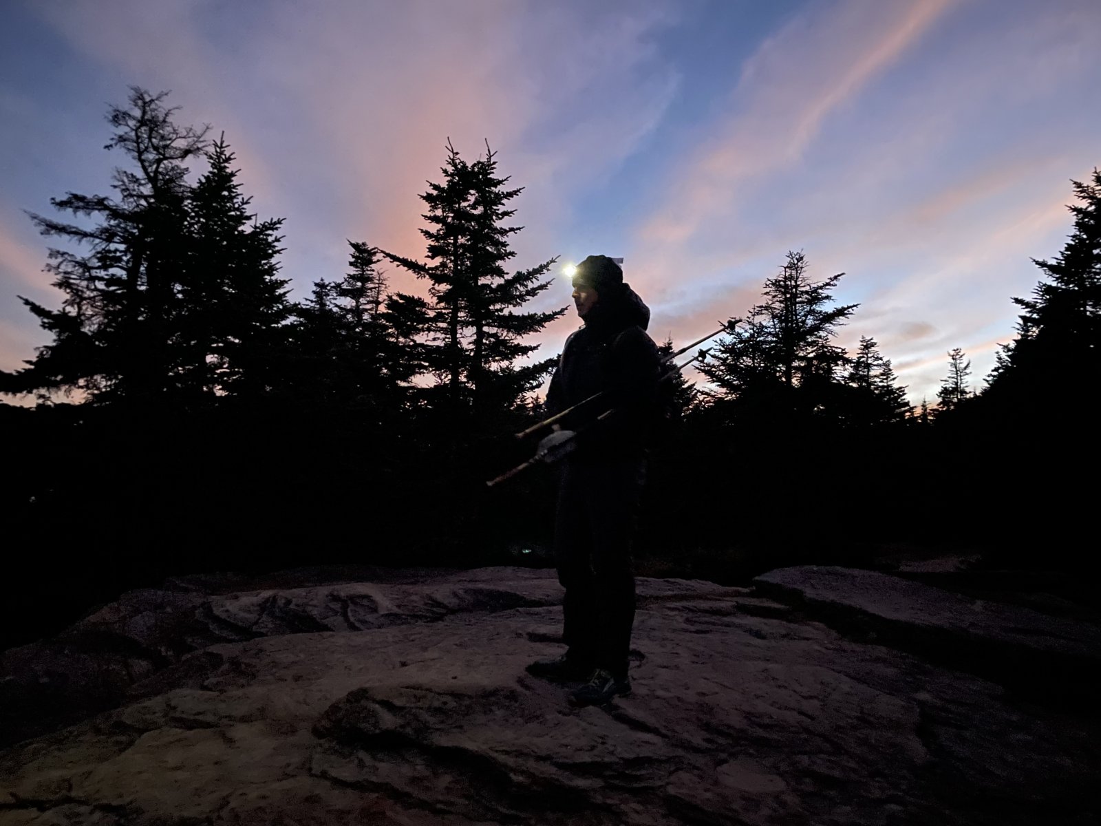 7pm; 0.7 miles from the summit we hit the junction for the trail to the parking area. Time to boogie into the night.