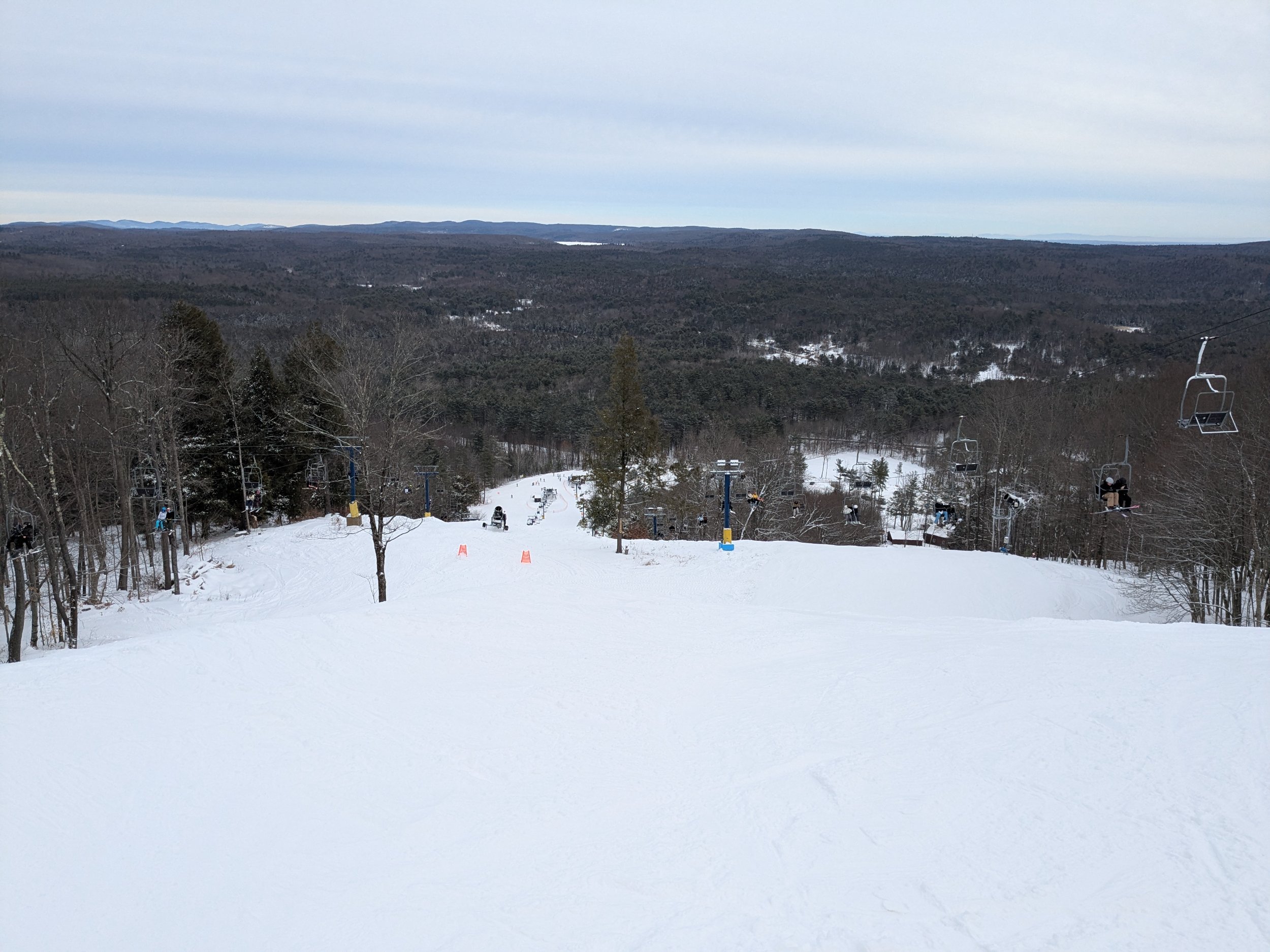 It was another busy day at Royal. I arrived at 1, and fortunately the Sunday ski school staff was able to handle the workload so I was able to get right out on the main mountain. It was an excellent packed powder surface all around. Challenge was skiing the best so far for me this year (since I missed the powder part of yesterday's powder day). I decided it was time to try out Doc's Drop which was thin but fine, and also decided it was time to try a couple of glades. I started slow, with Maiden (thin in spots, still skiable) and Merchant (really nice, still some powder to be had). I made 10 really enjoyable runs and got to ride the lift with a few Royal first timers as well as some regulars. There were short lines at both lifts for the first hour I was there, I'd say up to about a 20 chair wait once or twice. Thinned right out after 2.