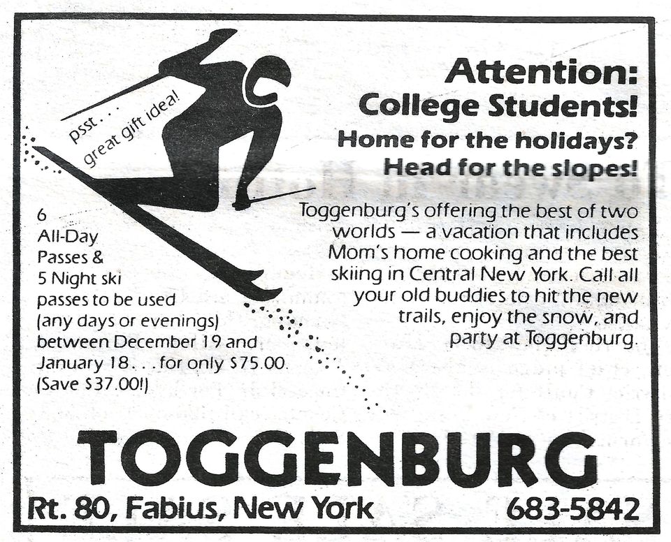 I remember skiing classmates going mainly to Greek Peak or Labrador. Togg and Song were rarely mentioned and places like Ironwood Ridge or Intermont were completely off the radar.