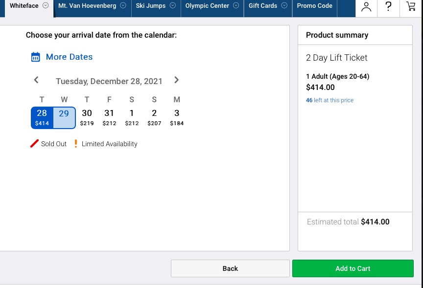 Well not blind but I wasn't reproducing the bug until now. Probably requires a call to them.Are you guys blind? Look at the image, 2 day lift ticket, 1 adult. Today and tomorrow are highlighted showing $414. When I clicked on other days in the future, including over MLK it goes down to about ~$100/day.