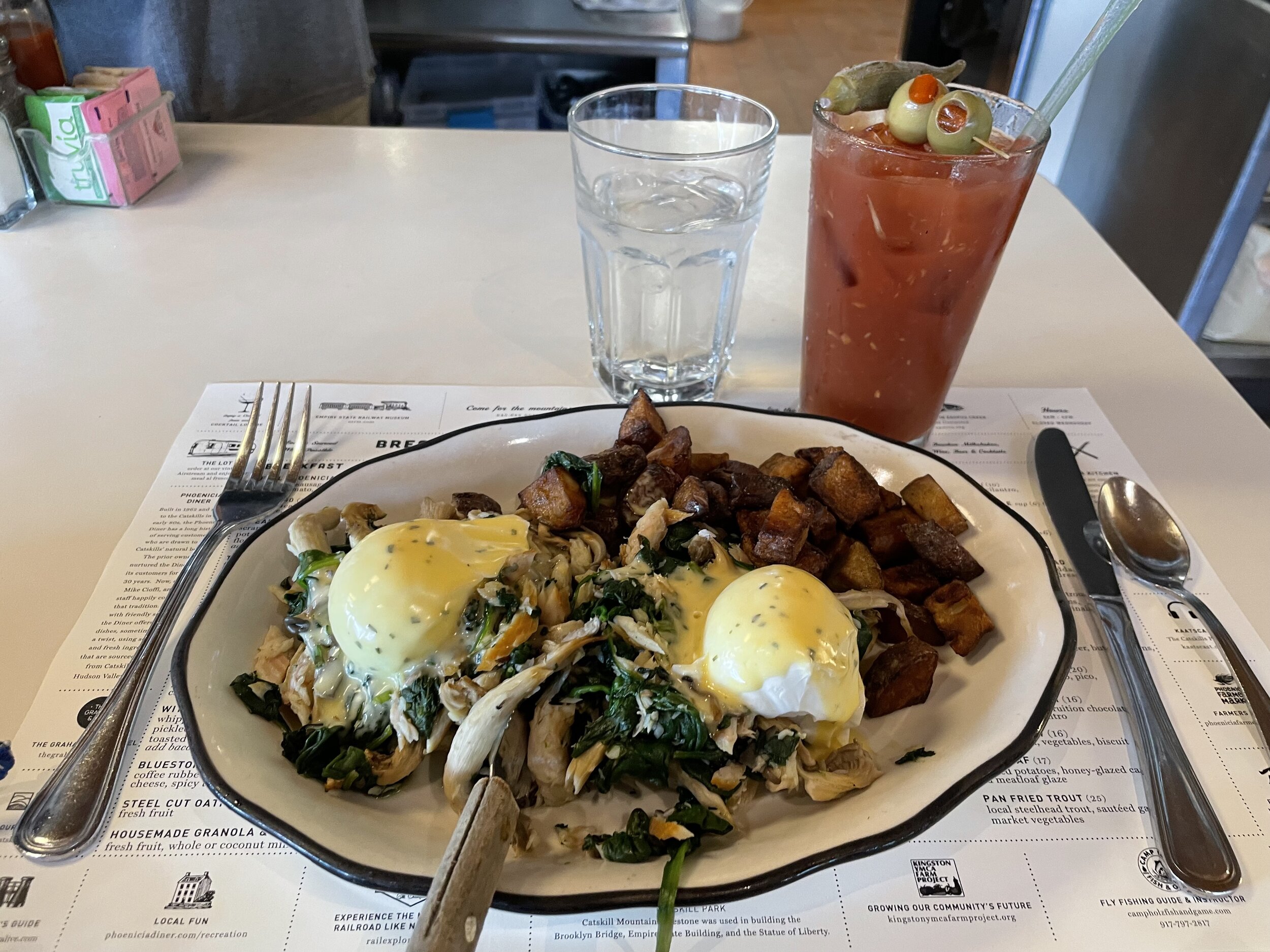 Eggs Benedict with Oyster mushrooms, spinach and smoked trout.