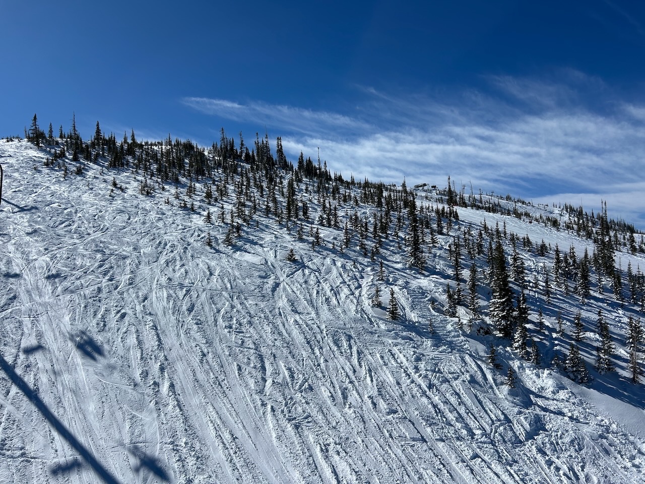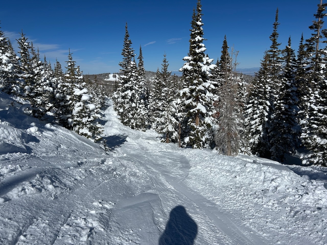 While it's possible to ski between the two peaks, could take a while for a beginner or intermediate skier because of a couple of flat sections. We chatted with an older snowboarder who was waiting for the free small shuttle bus that does a continuous loop all day. But the bus is actually for the entire town of Brian Head, so going from Giant Steps to Navaho isn't direct. For an advanced skier or any intermediate willing to pick up speed on a blue before a cat track it's better to stay on snow.