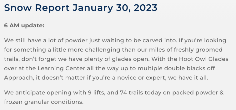 Read that top paragraph. The double black glades off of Approach are Cloudsplitter and Slide View ... neither of those are open. While the text doesn't ACTUALLY say that those glades are open, it certainly gives the impression that they are. 10th Mountain Division glades are "technically" off of Approach, however, you can't get directly to them from Approach. 10th Mountain is listed on the conditions report as open, though when I skied past it several times yesterday, the entrance from the bottom of Upper Northway was roped.