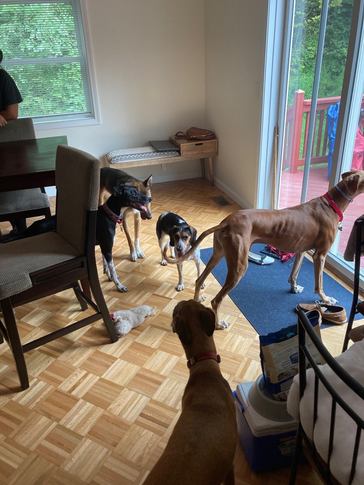 So interesting to see a pack of 5 dogs moving together from room to room.