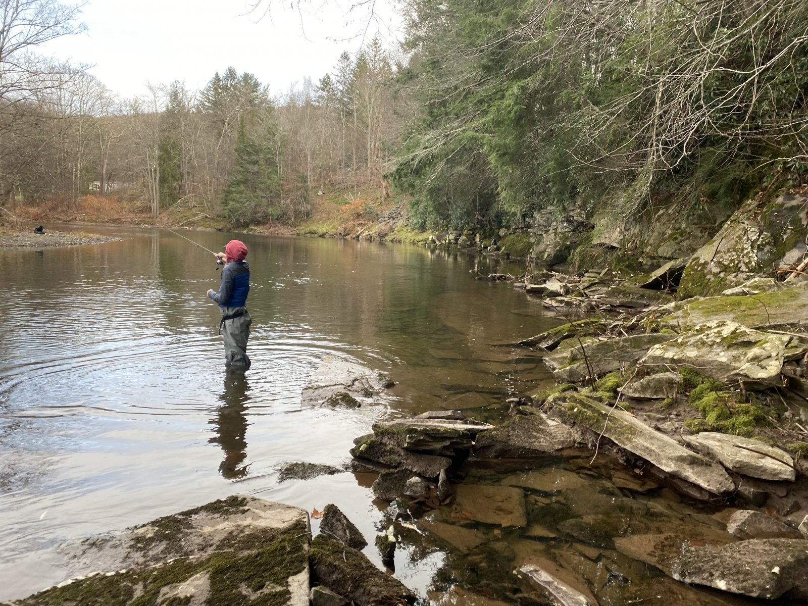 The Hazel Comfort Station on Rt. 17 is a pretty cool spot. A DEC designated special trout fishing area, with the convenience of being at a rest stop. Despite the convenience of it, the two times we’ve been there this fall we haven’t seen another soul fishing. Perhaps it’s a madhouse other times, we’ll find out next spring. The creek in this area has a lot of variety, with shallower areas of river rock, some sandy stretches, and numerous deep pools next to sheer rock faces, with rocky ledges in the water. We started in the area we first found success, a sandy bottom with a deep pool next to a 12 foot rock face with a rope swing. Nothing biting there we decided to move upstream a bit. After a bit, throwing a few casts here or there, nothing biting, things weren’t looking great, as Rip suspected would be the case. But there….in the distance just a bit further upstream….it had a different look, glassy, calm. Hadn’t seen that anywhere yet, so we’d push on to check it out before exploring the areas downstream of the rest area.