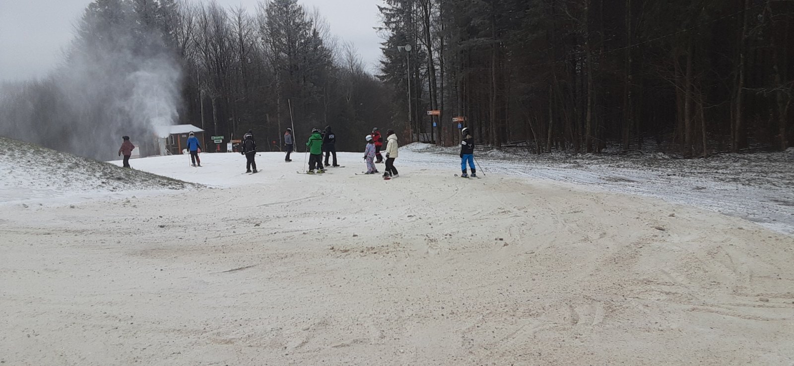 A little bleak for almost Christmas. What was there skied ok, pretty soft and edgeable, for the most part. Skied from opening till about 10, that was plenty for me. Hot Buns were a big plus today, most seats glazed with a thin coating of ice. Rained off and on, mostly on.