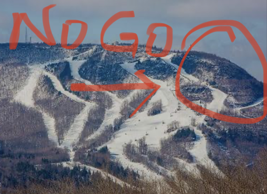 We went to the bar to recover then into the woods for a J bird between the Cliff and Jimmy Huega. Not good since we found ourselves completely cliffed out. There was some serious combat skiing to negotiate the cliffs in the woods. I resorted to bending over some trees to rappel over the rocks. Ended up above the rock cut of White Cloud and was able to slide down the frozen ice falls to a mandatory 15 foot drop onto the run with an uphill landing. Scared the shit out of an intermediate who saw me fall from the sky. Good times.