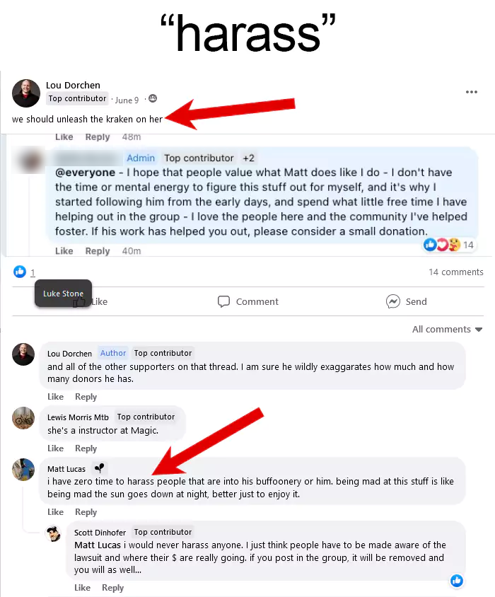 Here's an example recently of one of them trying to get people to go after one of my female moderators because she said something nice about me in a fundraising post from last June. He also suggested going after all of my supporters. I blanked out her name because she was in fact concerned about this threat after seeing it directed at me for over 3 years. These aren't good people.
