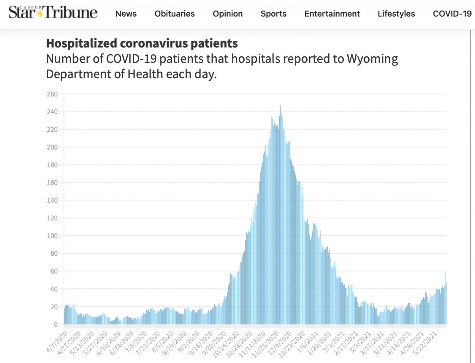 Unfortunately, WY looks like a state where the combination of dropping the statewide mask mandate relatively early and having low vaccination rates is resulting in increased number of people being hospitalized. The vaccination rates is one of the lowest and varies quite a bit by county. WY has about 600,000 people, largest city is the capital Cheyenne with about 60,000 people. The statewide mask mandate was dropped in mid-March. The number of cases starts increasing soon after. The few other restrictions geared to encourage social distancing were gone by May 21, 2021. Jackson Hole is in Teton County, which has been much more pro-active about mask usage and testing. By the time my friends and I skied at JH in Dec 2020, everyone riding lifts was pretty used to masking up consistently. But I heard from my friend who is a long-time ski instructor that the situation in town made her pretty nervous.