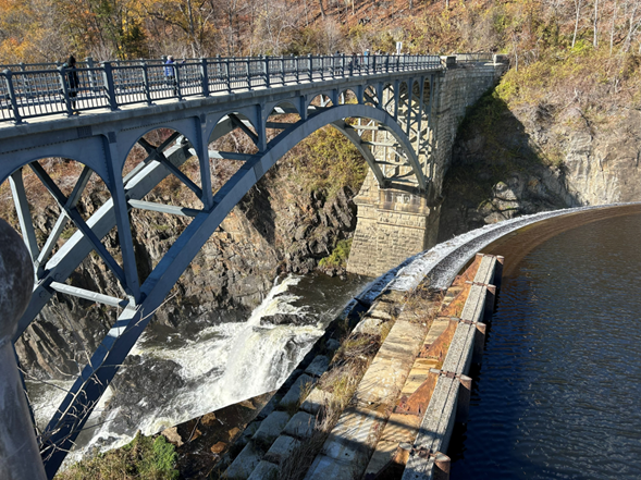 The road at the top of the dam is pedestrian only. I remember when you could drive on that road. I also remember when, in my misspent youth while going too fast in my 1969 Malibu on a really foggy night, I was inches away from crashing head-on into a stone barrier when that 90 degree turn at the end of the bridge in the below picture suddenly came out of nowhere.