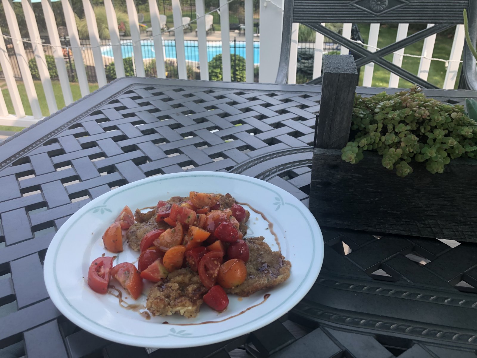 As for my lunch...made a batch of breaded chicken cutlets/chicken parm yesterday. Today I whipped up a quick tomato salad, with a spoonful of pesto for good measure, finished with a drizzle of balsamic reduction.