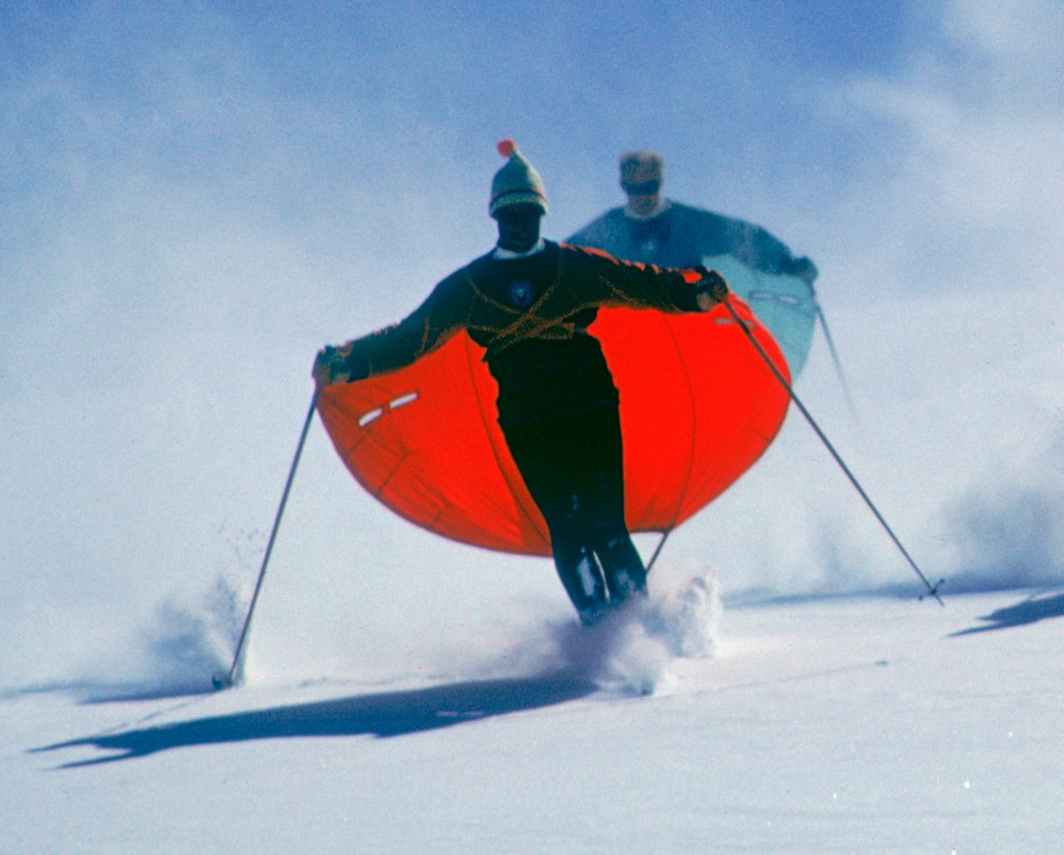 Weak attempt at a wing suit and/or a tribute to butterflies.What is that? Does it turn your front-side groomer skis, in powder boards?