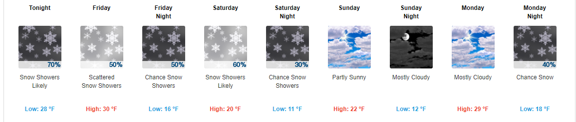 Radar shows lake enhanced and lake effect light snow showers streaming off of Lake Ontario and Lake Erie, these are making it into Northwest Pennsylvania and the Finger Lakes as well as the Catskills and Poconos, only minor accumulation can be expected. For today temperatures what you see right now is basically what you will see today going into the early evening. Then tonight temperatures will plummet as the cold air moves in.